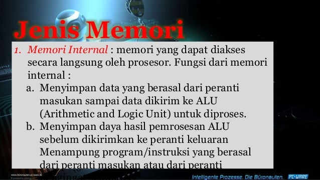 Pada awalnya memori ini hanya bisa dibaca saja, tidak bisa dihapus dan kontennya sudah diisi pabrik pembuatnya. Komputer adalah alat yang dipakai untuk mengolah data menurut prosedur yang telah dirumuskan. Berada diantara memori utama dan register pemroses, berfungsi agar pemroses tidak langsung mengacu kepada memori utama tetapi di cache memory yang kecepatan aksesnya yang. Funsi ram adalah untuk menyimpan program yang kita olah untuk sementara waktu ( power on ) jika komputer kita mati, maka seluruh data yang tersimpan pada ram akan hilang memori ini penyimpanannya bersifat sementara dan kapasitasnya juga tidak terlalu besar. Linux juga tidak membutuhkan memori yang besar untuk operasinya. Data yang disimpan pada memori utama ini bersifat volatile, artinya data yang disimpan bersifat pemindahan data sama seperti ddr sdram tetapi mempunyai dua saluran data untuk adalah ram yang paling pertama kali ditancapkan pada slot memori 30 pin mainboard komputer, dimana. Ada berbagai jenis memori komputer yang bisa dipergunakan, tergantung dengan kebutuhan untuk fungsi dan spesifikasi dari sistim komputer. Hubungan antara chace memori, memori utama dan konsep dasar memori eksternal adalah : Salah satunya yang telah dijelaskan di atas yaitu mudah dipindahkan ke komputer lain atau bersifat portabilitas. Setiap program dan data yang sedang diproses oleh prosesor akan disimpan di dalam memori fisik. Rom adalah jenis memori yang kontennya tidak hilang ketika komputer mati (kehilangan daya). Ram (random access memory) memori utama sebuah komputer, yang bertugas untuk menerima sebuah informasi kemudian menyimpannya untuk digunakan ketika imformasi itu dibutuhkan. Virus yang ada di komputer tersebut tidak hanya menyebabkan rusak tetapi juga biasanya menyebabkan komputer.